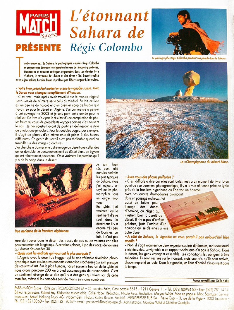 En bordure du désert Libyque, près de l'oasis de Farafra, ce surprenant labyrinthe de rochers blancs qui se noient dans le sable roux du Sahara. Le photographe, connu pour ses paysages aux lumières particulières, a voyagé en Algérie dès 2000, six mois plus tard en Libye et au début de 2004 en Egypte puis au Niger.«Le sud de l'Algérie a vraiment été une découverte: ce désert est un des plus beaux et variés du Sahara.» Des forêts de roches dévorées par les sables brûlant défient le ciel. Des pitons et des châteaux de pierre annoncent le Hoggar, massif d'origine volcanique qui culmine à près de 3000 mètres. «Dans le Sahara, les couleurs sont faussées par le soleil, explique Régis Colombo. La lumière est bonne les cinq premières minutes du lever du soleil et les cinq dernières du coucher. »Les jeux de lumière y sont multiples et vont colorer le sable différemment. Le reste de la journée, la lumière devient si intense et aveuglante qu'elle aplatit tout et écrase le relief.» Le photographe a souvent travaillé en angles panoramiques, ce qui donne une dimension cinématographique à ses clichés qui souvent ressemblent à des peintures. Au fil des pages, la beauté mystique des étendues de sable étreint l'imagination. Vous avez dit mirage?