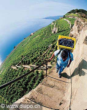 Il faut savoir qu'en Lavaux la grande majorité des vignerons sont encaveurs et qu'ils élèvent et commercialisent eux-mêmes leur production. Pour les vendanges c'est toute la famille qui se mobilise et qui engage des tacherons. De partout en Europe, et même du monde entier, les vendangeurs et les vendangeuses débarquent et s'engagent pour une quinzaine... « On a eu des Canadiens, des Australiens, des Polonais, des Péruviens, des Français et des Suisses Allemands bien sûr... Il y a des fidèles qui viennent chaque année. » Monika, zurichoise de 28 ans, prend régulièrement ses vacances pour venir faire les vendanges à Rivaz. C'est fatigant, il ne fait pas toujours beau, « mais il y a une ambiance tellement extraordinaire, le soir aussi après le travail... » Après une année de vendange, Vassili, un Bosniaque de 26 ans, a quitté une place d'employé au Montreux Palace pour travailler toute l'année dans les vignes.