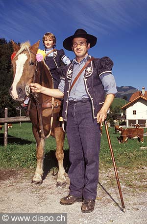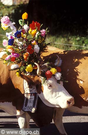 3074 - Lors de la Désalpe, la Rindya en patois, fête traditionnelle des montagnards fribourgeois, les vaches sont décorées de cloches carillonnantes et de fleurs afin de leurs rendre hommage.