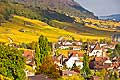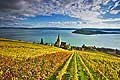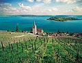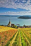 10449 - Photo : le vignoble de Ligerz avec son église dans le canton de Berne et le lac bienne avec l'île de Saint-Pierre