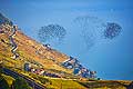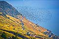 10400 - Photo : Suisse, Vol d'étourneaux sur le vignoble de Lavaux et le Lac Léman - UNESCO